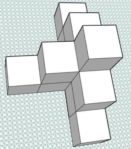 Cada cubo de los 12 que componen la escultura, tiene 1 metro de lado y siete de ellos están haciendo contacto con el suelo. Si se quiere cubrir la obra con láminas que metal, entonces la cantidad de metros cuadrados de lámina que se requiere es de: