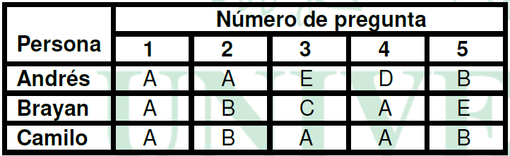 Andrés, Brayan y Camilo presentaron un examen de selección múltiple compuesto por cinco preguntas, cada una de ellas con 5 opciones (A, B, C, D, E). En la siguiente tabla se presentan las respuestas elegidas por ellos.
